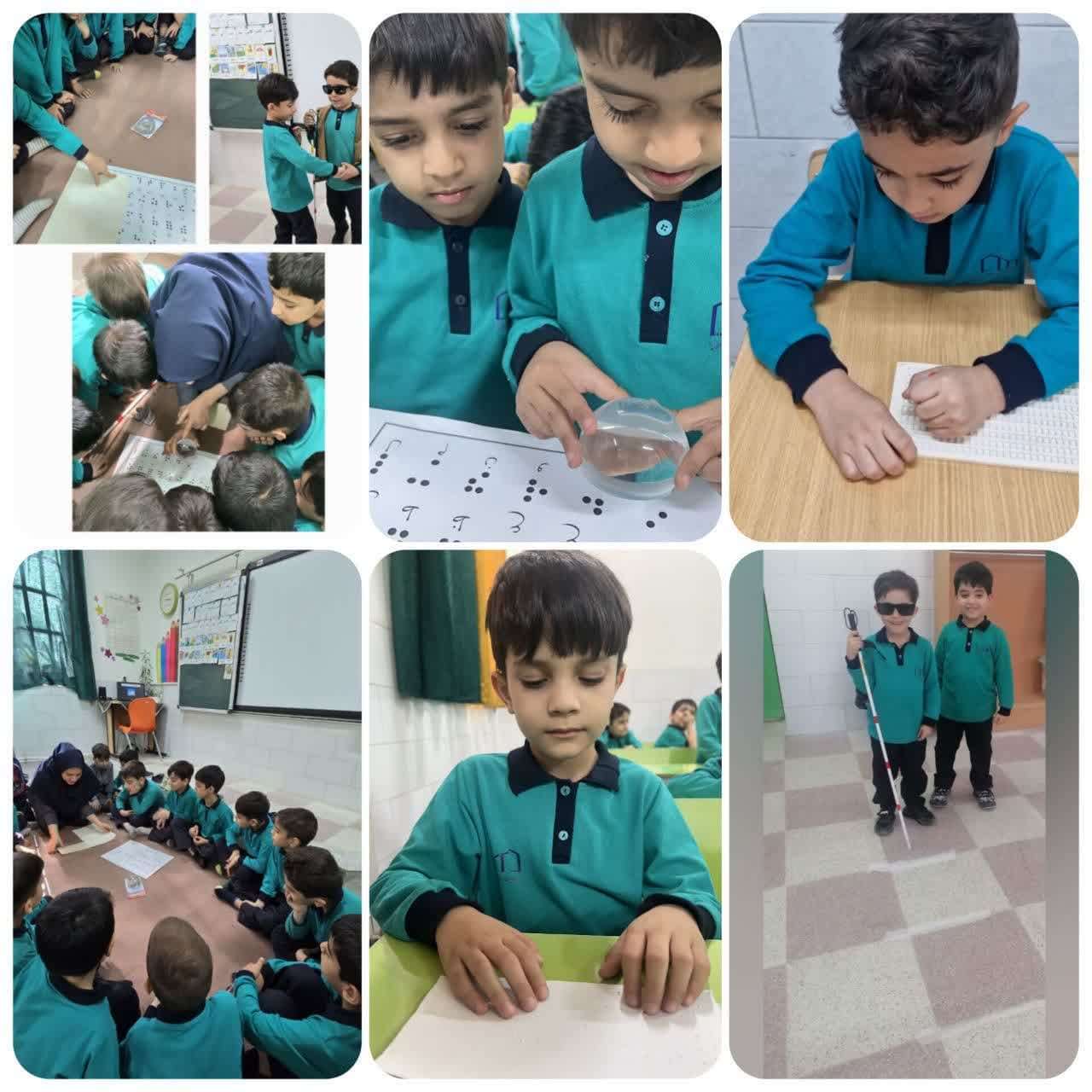دانش آموزان پیش، دبستانی و دبستان مهندس افضلی پور در روز جهانی نابینایان با همکاری دبستان استثنایی رسولیان با ابزار و وسایل آموزشی(گوی ذره بینی،صفحه نوشتن،مداد، خط بریل،عصای سفید) افراد نابینا و کم بینا آشنا شدند و همچنین مهارت برخورد درست با این افراد رابا نمایش و فیلم آموزشی یاد گرفتند و در پایان شکرگزاری خدا را به جا آوردند.