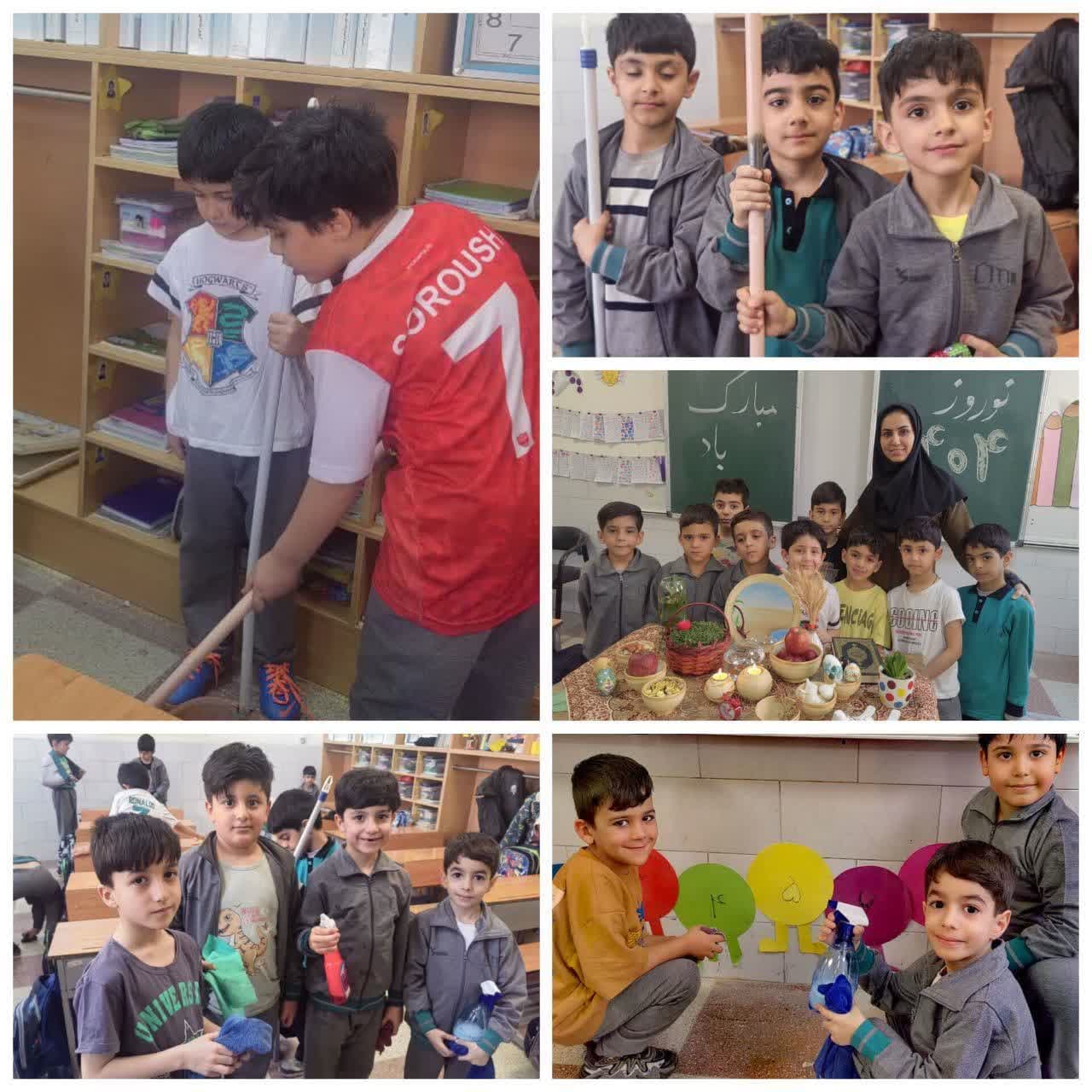 "دانشآموزان دبستان مهندس،افضلی پور با همکاری معلم خود، در پایان سال کلاس را تمیز کردند. همچنین، با کمک همدیگر، سفره هفتسین را آماده کردند تا فضایی شاد و خاطرهانگیز برای همه ایجاد شود.